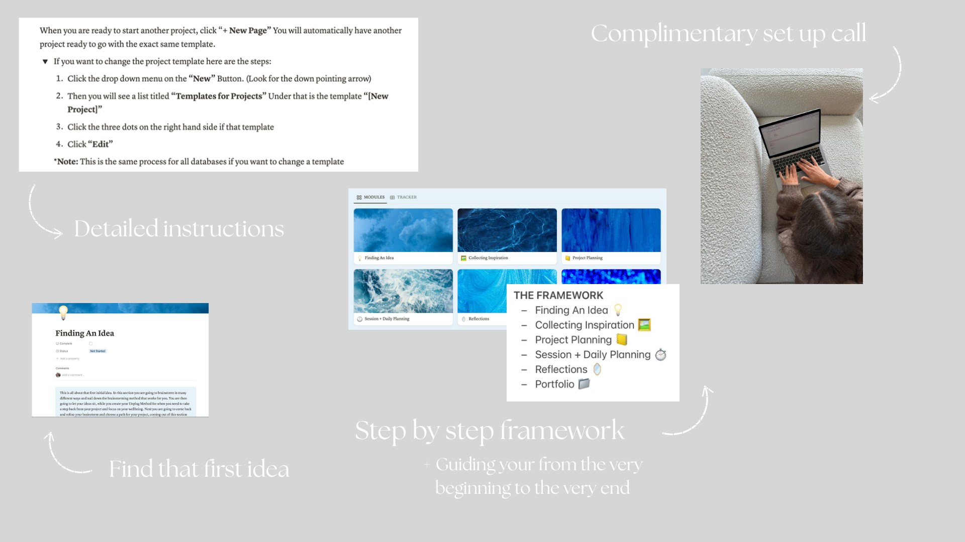 Every template comes with a complimentary set up cal where we will walk you through getting started with Notion, customizing your workspace, and make sure you feel confident using every tool from day one.