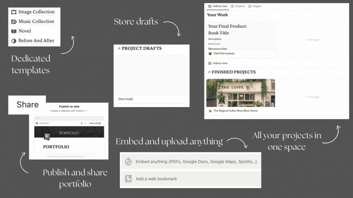 The Portfolio section gives your creative work the space, structure, and freedom it needs to grow. Whether you're tracking a project from concept to completion or simply archiving moments of inspiration.