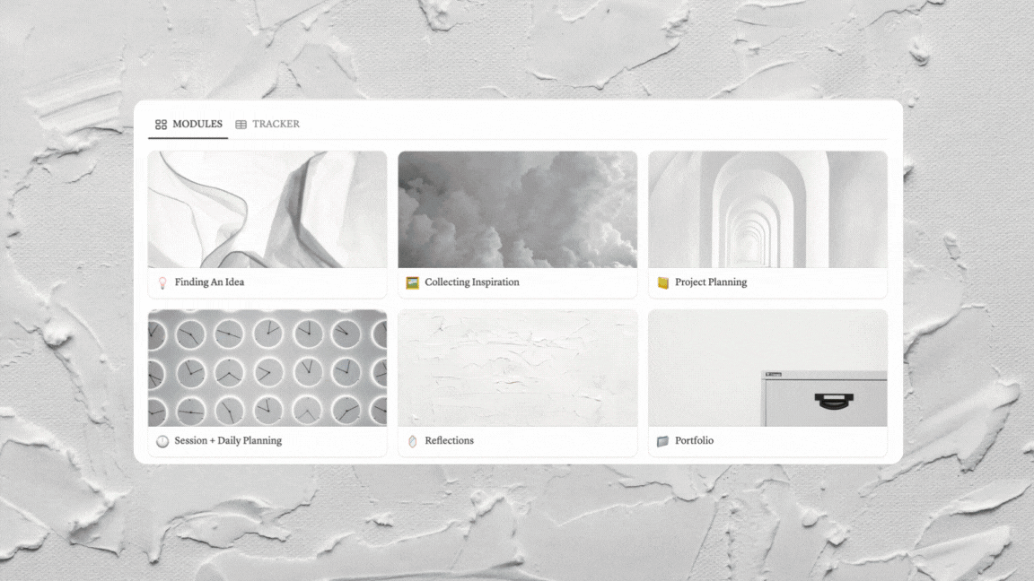 Our signature step by step framework walks you through the entire creative journey—from your first spark of inspiration to storing and showcasing your work. It includes 6 dedicated modules and over 50 templates to help you stay organized every step of the way.